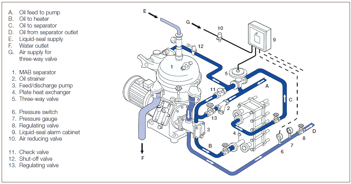The oil is pumped, heated, and separated as shown in the figure. A liquid seal in the separator bowl prevents the oil from escaping through the water outlet. If this seal is broken, an alarm device is activated. With unmanned engine rooms, the signals are transmitted to a remote control unit. When the seal is broken, the three-way valve shuts off the oil feed and the oil is recirculated until the fault is corrected.