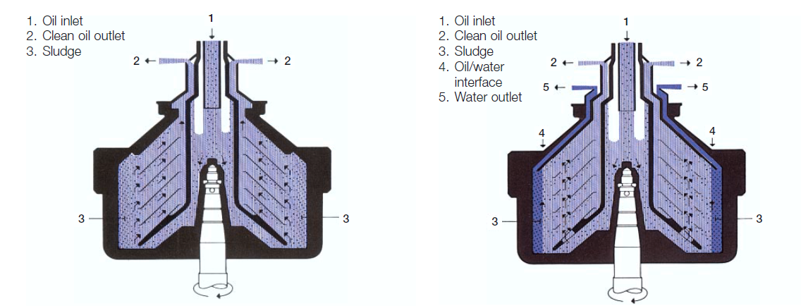 Separation takes place in a solids-retaining bowl that can be arranged for either clarification or purification. In both cases, the contaminated oil is fed into the separator through the centre, and it is separated by centrifugal force into its various phases, the heaviest phase (sludge and water) being forced outwards to the periphery of the bowl. The accumulation of sludge is periodically removed from the bowl by hand.