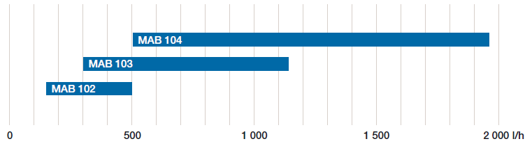 Blue bar indicates range from minimum economical throughput on detergent type lubricating oil to maximum recommended throughput on distillate (1.5–5.5 cSt/40°C).